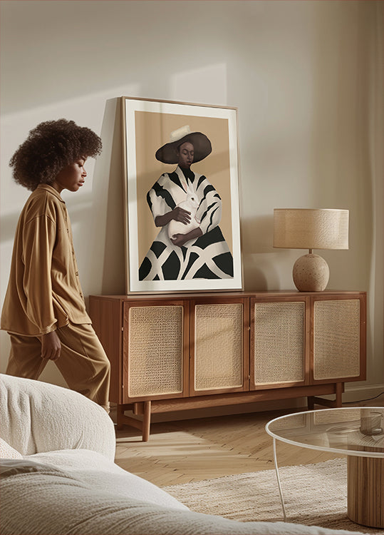 En kvinde i sort-hvide striber holder en hvid kanin tæt ind til sig, mens blikket er roligt og intenst. De grafiske linjer møder blød pels og skaber poetisk kontrast, der emmer af nordisk minimalisme. Et stemningsfuldt portræt af Nadjaa, perfekt som elegant statement til stue, soveværelse eller entré.