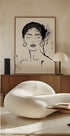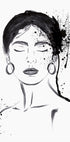 Et slående sort-hvidt akvarelportræt af en kvinde med lukkede øjne, markante læber og iøjnefaldende øreringe. De flydende blækstænk og den minimalistiske penselføring skaber en moderne, kunstnerisk stemning, der føles både udtryksfuld og rolig — perfekt til at løfte en gallerivæg eller tilføje et sofistikeret præg til din indretning.