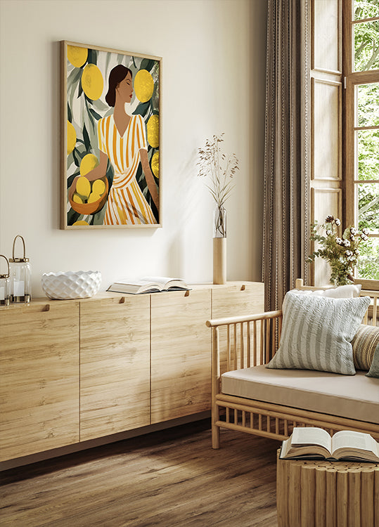 En livlig og elegant illustration af en kvinde i en gulstribet kjole omgivet af frodige citrontræer. Med en skål friskplukkede citroner i hånden udstråler hun sommerlig varme og middelhavsstemning. De bløde farver og harmoniske komposition gør plakaten ideel til moderne boligindretning.